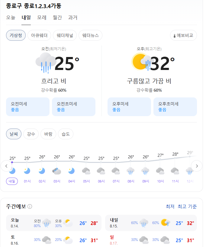 여름 막바지에 접어든 8월 중순, 서울은 여전히 한여름 무더위가 이어지고 있습니다. 내일 오후에는 갑작스러운 강한 소나기와 뇌우가 찾아올 가능성이 높아, 외출 계획이 있다면 미리 대비하세요.